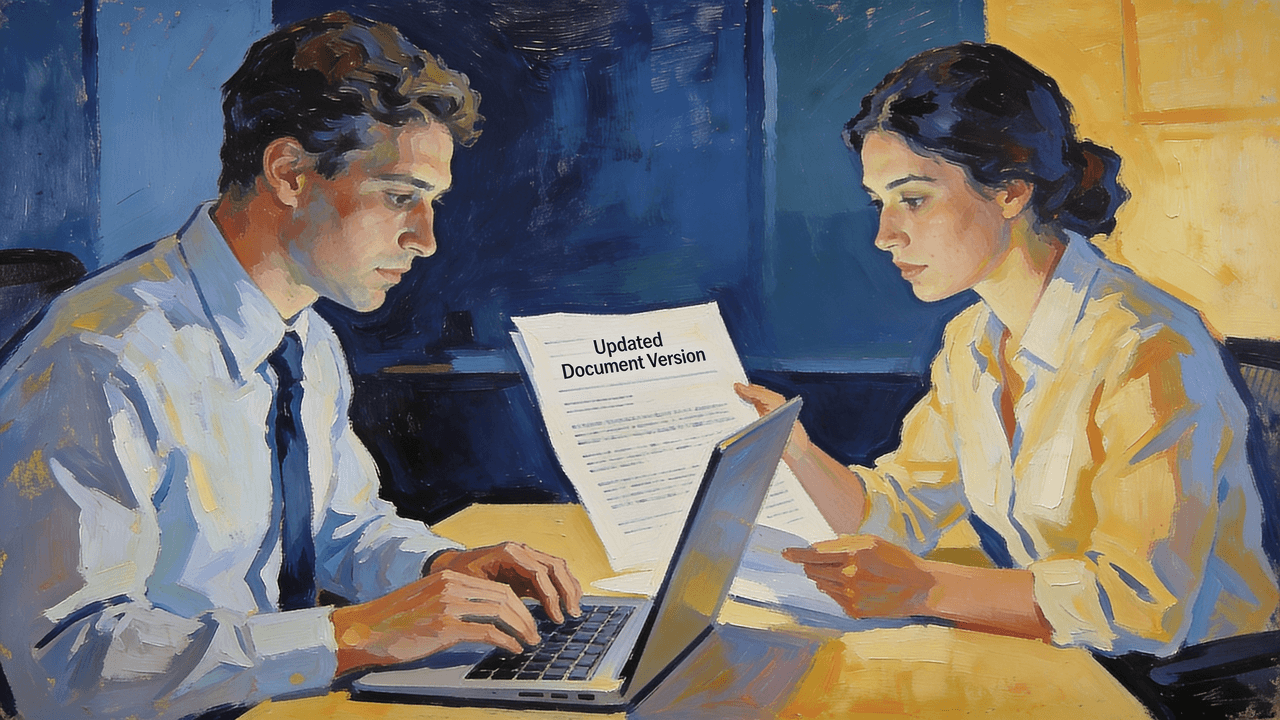 Po kelių mėnesių priimami du nauji žmonės. Vienam jų vadovas persiunčia seną onboarding laišką su ankstesne dokumento versija. Tuo pačiu dalis esamų darbuotojų niekada nepatvirtino naujos redakcijos, bet kažkur lentelėje vis dar pažymėta, kad dokumentas „išsiųstas visiems“.